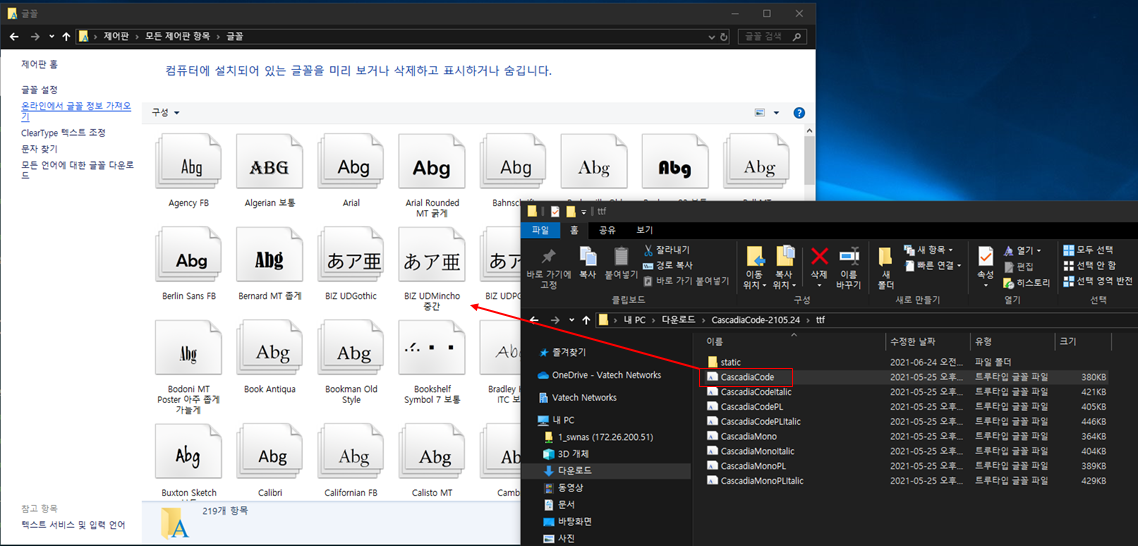 폰트 파일 링크 : https://github.com/microsoft/cascadia-code/releases/download/v2105.24/CascadiaCode-2105.24.zip