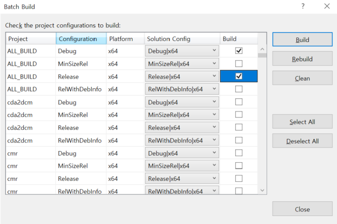 - 메뉴 Build - Batch Build 후 All_BUILD 체크 후 Buildd 클릭하여 빌드 진행