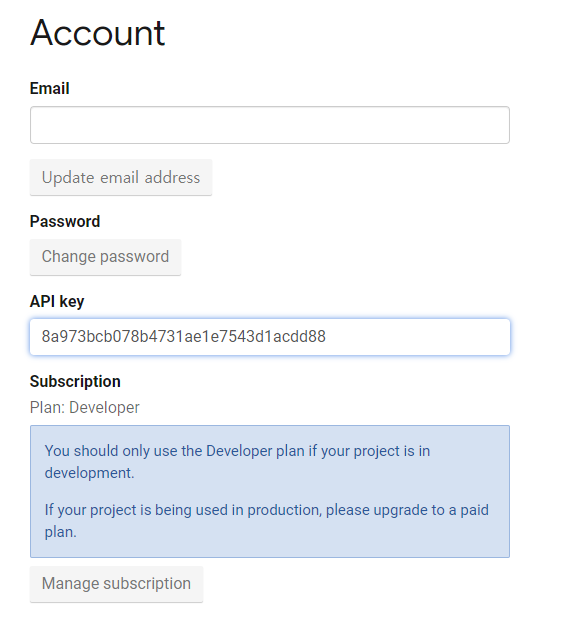 newsapi에 접속하고 로그인을 하면 아래화면과 같이 API Key값이 생성됩니다.
