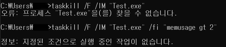 실제 cmd에서 taskkill을 해보면 추가 파라미터가 없는 경우 오류로 처리되는것을 확인할수 있다.