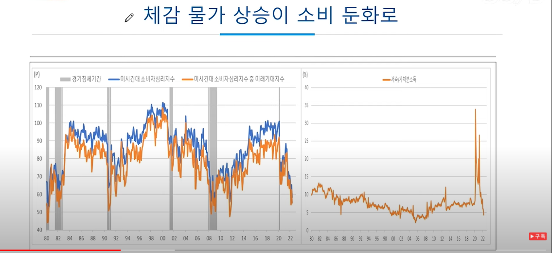 위 차트에서보면 미국의 소비심리지수가 않좋다. 저축도 금융위기 이전수준까지 내려왔다.