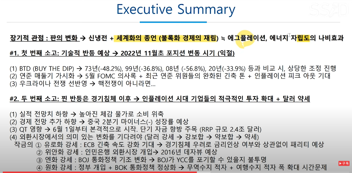 찐반등은 경기침체 이후다 그 이후를 봐야한다. 월가에서는 경기침체는 필연적이고 내년 연말쯤 올것이라는 컨센선스가 있지만 빈센트는 내년초에 올것 같다고 예상하고 침체 기간은 짧을것으로 예상함
