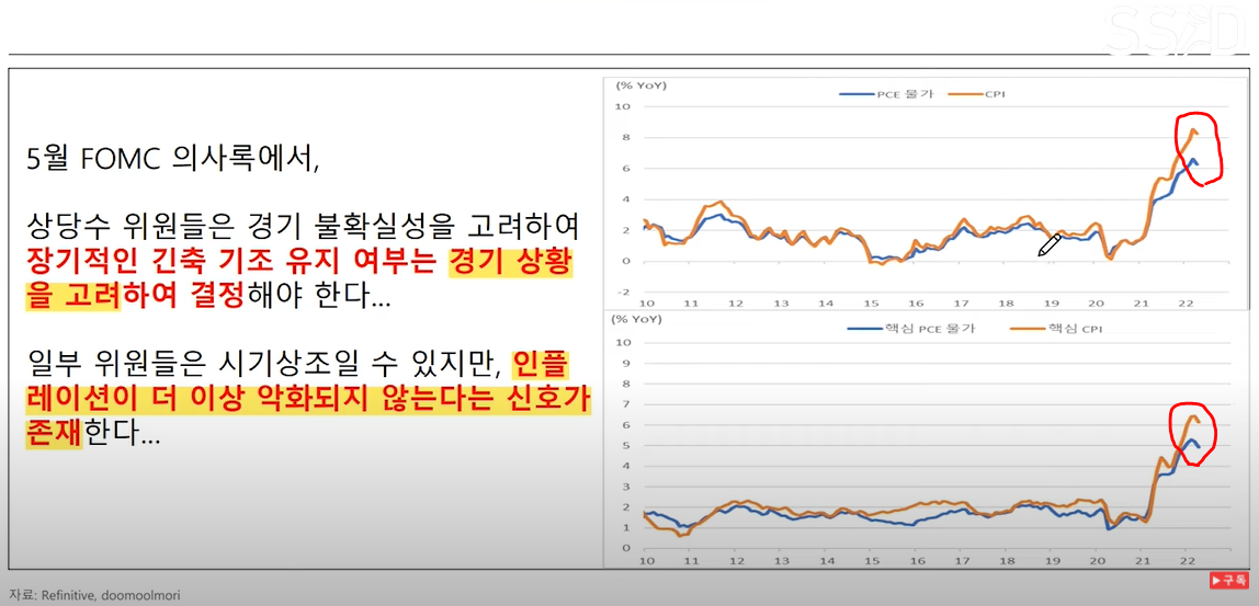 5월 FOMC에서 인플레이션을 잡기 위해서 자이언트 스탭등 무조건 금리를 올린다고 했지만 의사록을 봤더니 경기 상황을 고려해야한다는 내용이 있다. 실제 경제지표를 보니 인플레이션이 더이상 악화되지 않는 다는 신호가 있다