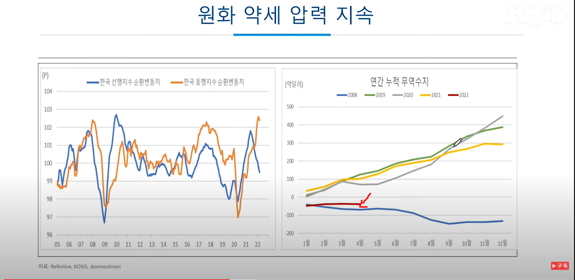 우측의 연간 누적 무역수지에서 보면 올해 4개월 연속 적자가 발생하고 있고 이건 2008년 금융위기때(파란색) 이후로 처음이다.