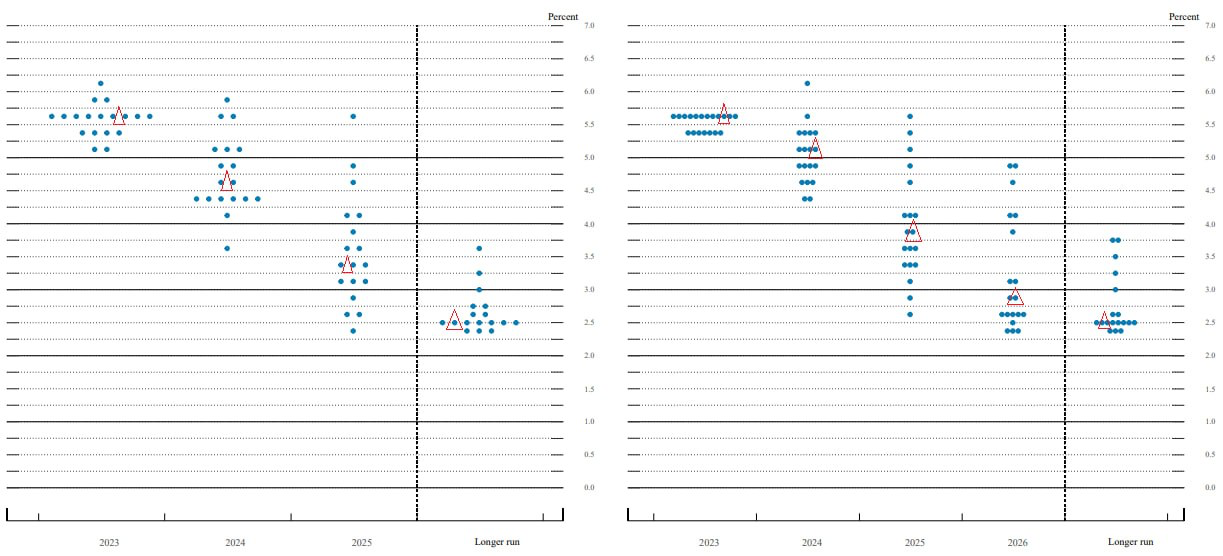 - 올해 점도표 중간값은 추가 1차례 인상 가능성을 여전히 남겨뒀음. 단, 5.75% 위에 점을 찍은 위원 수는 1명 ➡️ 3명 ➡️ 0명으로 감소 (추가 2차례 인상 가능성 소멸)