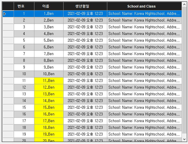 Sample ) 번호가 10번 보다 크면 Name cell을 노란색으로 표시 하도록 하는 코드
